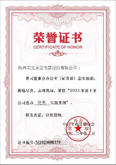 自宝光股份上市以来,董事会与管理层高度重视各项工作,董办团队切实关注各项履职能力提升,坚守初心,严格按照法律法规开展各项工作。获得此项荣誉充分体现了中国上市公司协会对宝光股份董事会办公室信息披露管理、治理机制建设、投资者关系管理、相关制度制定修订、ESG管理披露、监督培训等各项工作成果的高度认可和充分肯定。