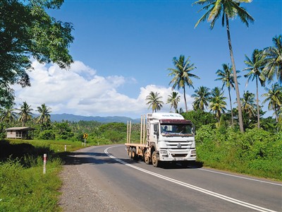 瓦努阿岛是南太平洋岛国斐济第二大岛。中铁一局斐济公司在岛上修建的纳布瓦鲁高速公路和布扎贝高速公路解决了人们出行的“老大难”问题,有力拉动了经济发展,被斐济民众誉为“斐中两国友好的纽带”“共同发展致富的高速路”。图为一辆卡车行驶在布扎贝高速公路上。 新华社记者 张永兴摄