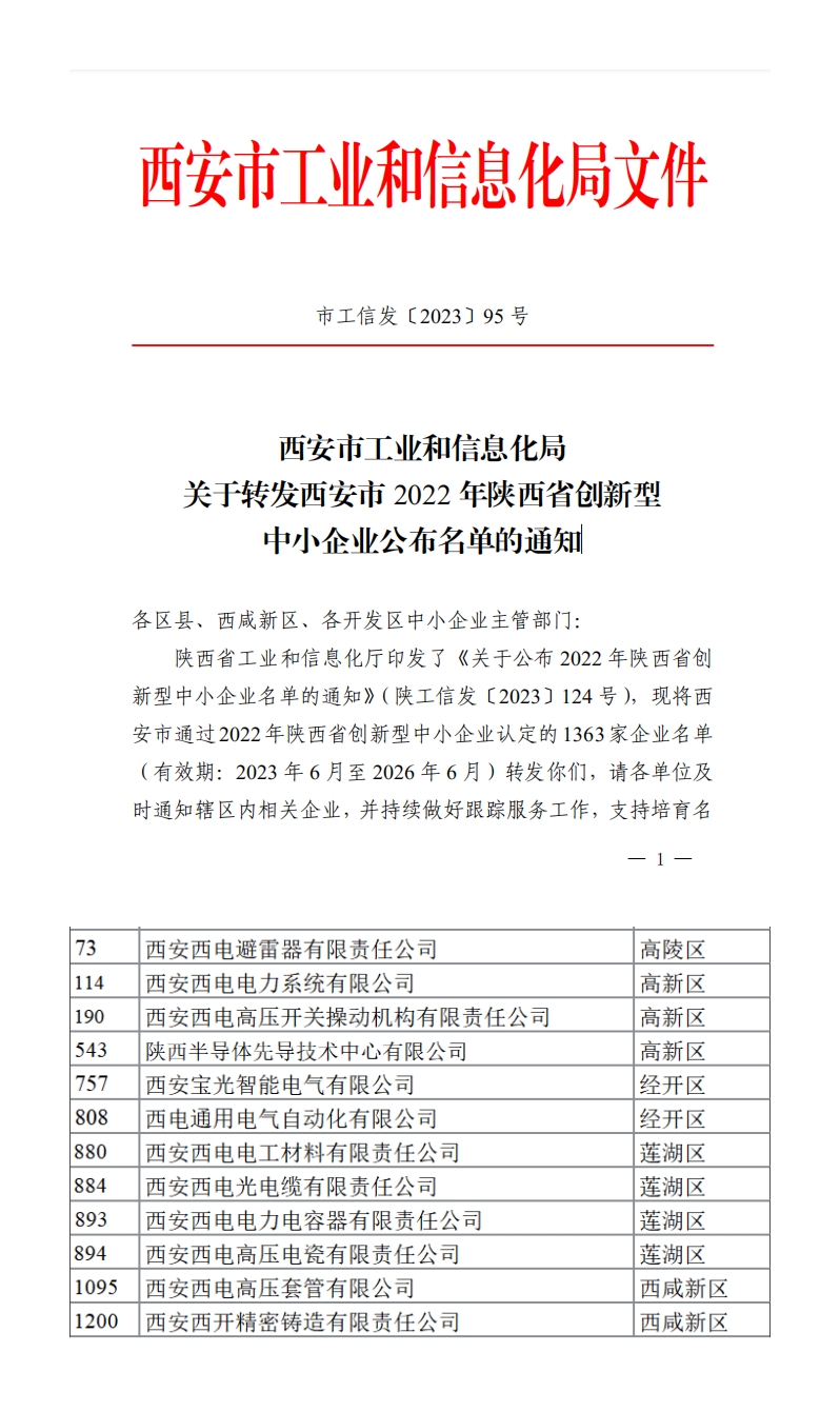 日前,陕西省工信厅印发《关于公布2022年陕西省创新型中小企业名单的通知》,文件公布了《西安市2022年陕西省创新型中小企业名单》,公司所属澳门新莆京游戏app大厅电力系统、澳门新莆京游戏app大厅套管、澳门新莆京游戏app大厅西容、澳门新莆京游戏app大厅西材、澳门新莆京游戏app大厅光电缆、澳门新莆京游戏app大厅避雷器、澳门新莆京游戏app大厅西瓷、澳门新莆京游戏app大厅操动机构、澳门新莆京游戏app大厅通用、西开铸造、宝光智能、先导中心成功入选,被认定为2022年陕西省创新型中小企业。