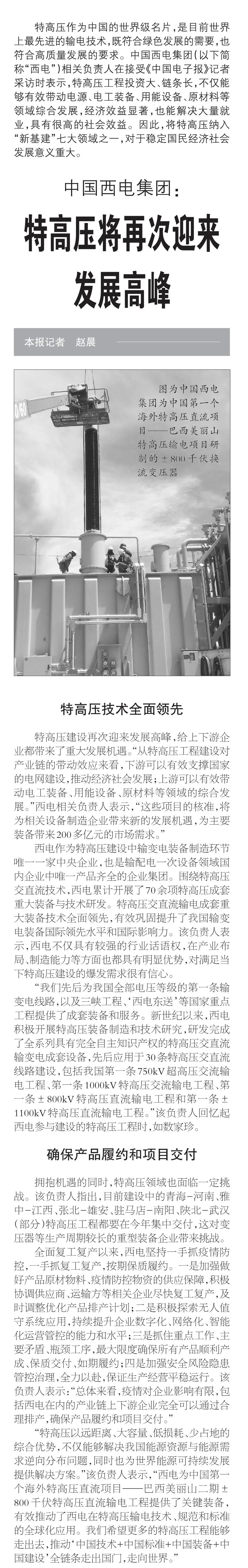 3月31日,中国电子报刊登了《中国澳门新莆京游戏app大厅集团:特高压将再次迎来发展高峰》一文,文章具体分析了“新基建”特高压建设带来的新机遇,详细介绍了中国澳门新莆京游戏app大厅集团作为国内输配电装备制造业中最具代表性的企业,领先的行业地位以及为我国电力建设作出的重要贡献,以及全面复工复产以来,紧盯重点工程、重大项目,抢时间、赶进度、保发展,确保产品履约和项目交付,奋力实现年度各项经营目标任务的央企担当。