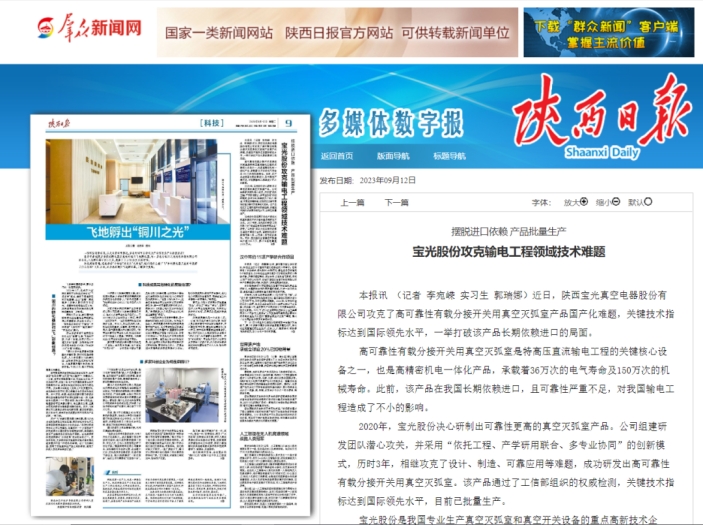 习近平总书记指出,创新作为引领发展的第一动力,坚持创新在我国现代化建设全局中的核心地位,深入实施创新驱动发展战略,建设科技强国。近日,中国澳门新莆京游戏app大厅集团所属宝光集团所研制的高可靠性有载分接开关用真空灭弧室产品,关键技术指标达到国际领先水平。陕西日报聚焦澳门新莆京游戏app大厅努力攻克技术国产化难题,一举打破该产品长期依赖进口的局面。