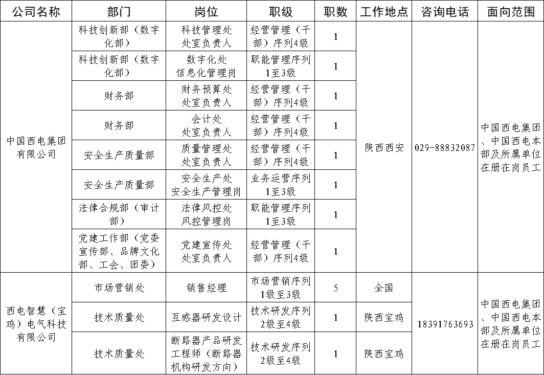 本次面向公司内部公开招聘岗位信息如下:
