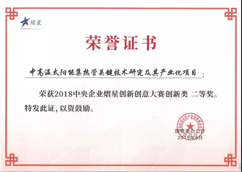 近日,由中国澳门新莆京游戏app大厅集团推荐,宝光股份申报参赛的《中高温太阳能集热管的关键技术研究及其产业化》获得2018年中央企业熠星创新创意大赛二等奖。 国务委员王勇出席大赛总结颁奖活动并讲话,国资委党委书记、主任郝鹏致辞,国务院副秘书长孟扬,中国科学技术协会党组成员、...